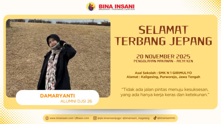 Damaryanti merupakan alumni Diklat Jepang Super Intensif Angkatan 26 di LPK Bina Insani Migrant Training Center, tempat di mana ia mulai membangun pondasi menuju masa depannya.