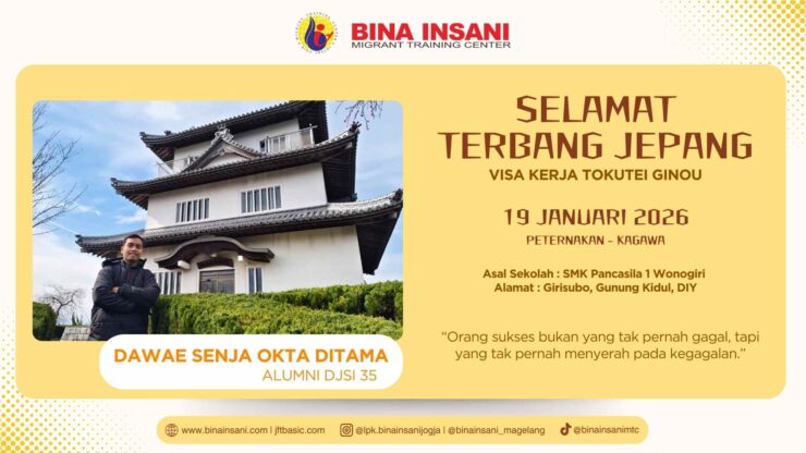 Selama proses tersebut, LPK Bina Insani Migrant Training Center selalu mendampingi penuh. Mulai dari pembelajaran, pendaftaran ujian Tokutei Ginou, proses seleksi perusahaan Jepang, hingga pengurusan dokumen kerja Jepang dan visa TG.