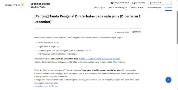 Mulai April 2026, seluruh peserta ujian JFT dan SSW wajib mengikuti aturan terbaru yang membatasi penggunaan Tanda Pengenal Diri hanya pada satu jenis dokumen saja. Kebijakan ini diumumkan sebagai langkah meningkatkan keamanan dan keadilan dalam proses ujian di berbagai negara.